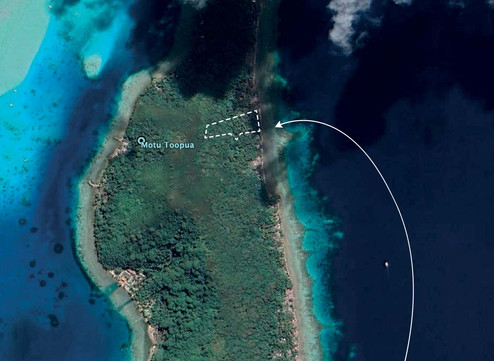 La propriété (marquée en rectangle blanc) et le motu vus du ciel.