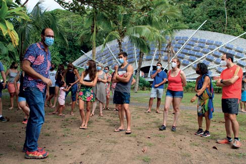 Le directeur confie : « l’accès au lycée pour les jeunes de Moorea est compliqué, le décrochage scolaire fréquent, les lieux de formations rares. » Souvent ils se sentent dévalorisés, alors qu’ils sont riches des connaissances de leur vallée. « Je vais les chercher dans leurs quartiers ! » intervient Lahiki, responsable à l’accueil. « Je leur dit qu’au lieu de planter du paka, il peuvent planter du taro ! ». Au Fare Natura, les jeunes du service civique apprennent la médiation scientifique et culturelle, l’accueil et la réorientation touristique, le travail de la terre (taro, canne à sucre, arachide), la transformation des cultures et la vente, la biodiversité avec le sentier des guetteurs. Après leur formation, ils pourront créer leur fa’apu, devenir guides de randonnée ou prestataire touristique, avoir un avenir, dans le respect et la connaissance de leur terre.
